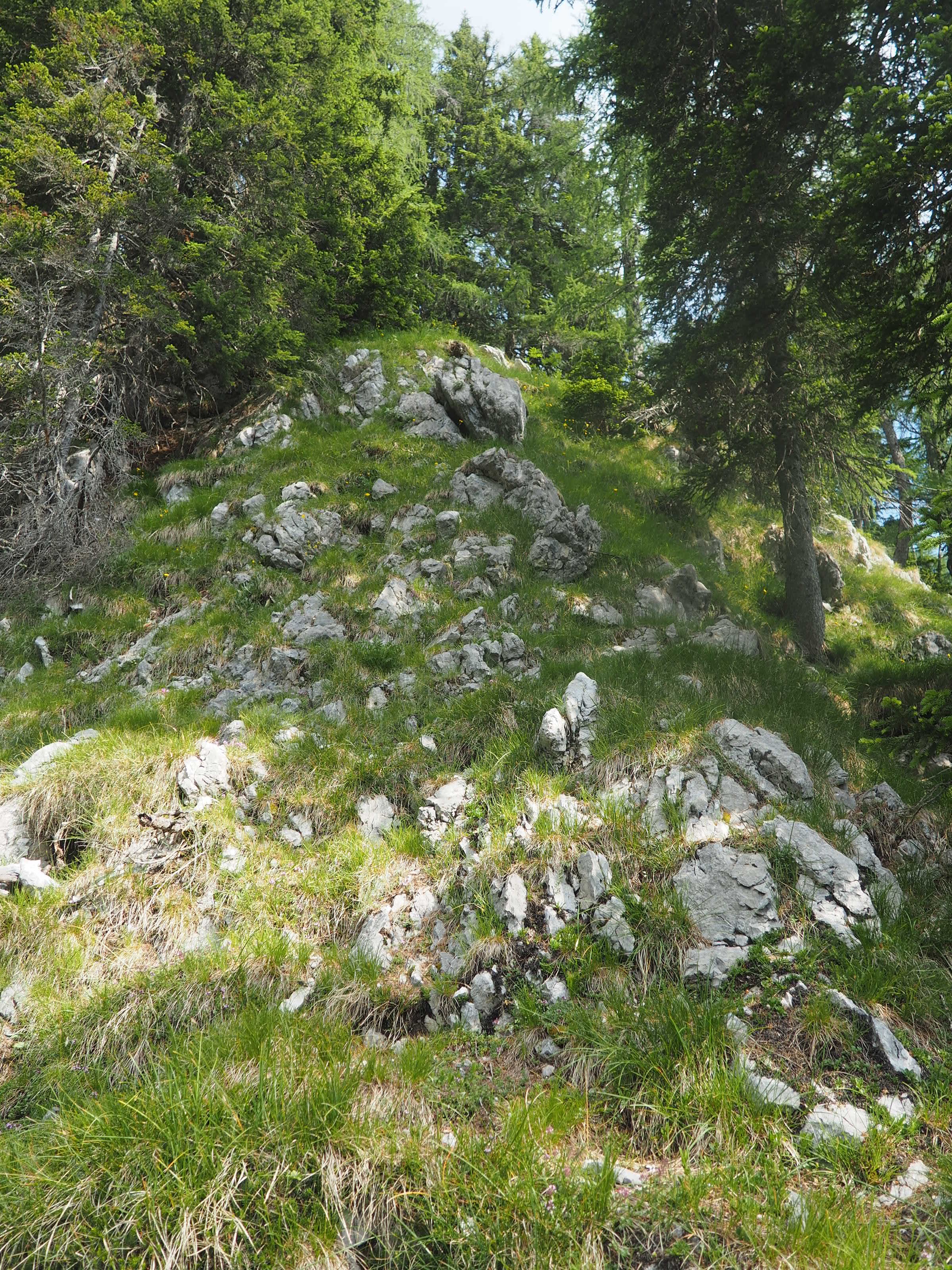 Ob svitu dneva spet naletim na skupino slovencev in skupaj rečemo kakšno hribovsko 😎 nato pa gremo vsak po svoje. Jaz se počasi pripravim in krenem v smeri koče Brazza. Nahrbtnik je bil težak, današnji plani pa ambiciozni 😀 spet zavijem levo in sledim stezi do škrbine Strmali in naprej proti Montažu. Ko se začne zahtevnejši teren se pojavijo tudi manjše zaplate snega, a nisem imel težav. Kakšno sem prečil, kakšno pa obšel. Višje gori sem na križišču poti, kjer zavijem desno v smeri zavarovane poti Leva. Pot preči po bolj ali manj izpostavljenih policah in je dobro zavarovana z jeklenico. Tudi tu prečim ali obhodim nekaj manjših zaplat snega. Za robom pridem v skalnato-travnat svet, jeklenic tu ni več. Nekaj 10 metrov, nato pa zavijem levo pri skali z lusko (možic) in se vzpenjam po dokaj strmem pobočju. Višje je vse bolj skalnato. Grem rahlo desno, da pridem do dveh plitvih grap, ki se dvigujeta proti grebenu. V grapah je nekaj snega, zato grem tam zraven. Gor grede se držim rahlo levo, nazaj grede pa grem nekoliko bolj desno (gledano od spodaj navzgor). Tu še enkrat srečam skupino treh slovencev, s katerimi sem se srečal zjutraj na Pecolu 😀 malce debatiramo, nato pa gremo vsak po svoje. Vzpon je kar strm, skalnat, mestoma je potrebno tudi poplezati. V pomoč so tudi možici. Ko dosežem greben zavijem levo in se povzpnem do najvišje točke. Špik nad Plazom oziroma Modeon del Montasio (2608 m) je krasen razglednik 😀 razgledujem se okoli in postane mi jasno, da bom moral spremeniti ambiciozen plan, ki sem ga imel. Me bo Lukec (spanje v bivaku Luca Vuerich) že počakal 😎😀 ko se naužijem razgledov previdno sestopim po strmem vršnem pobočju do zavarovane poti Leva in ji sledim levo, proti škrbini nad Cijanerico. (Sprva sem imel v mislih, da bi sestopil kar po pobočju Špika nad Plazom, ampak nisem bil ziher glede strmine in prehodov. Kasneje sem ugotovil, da bi šlo 😀 pa drugič.) Pot Leva nekaj časa preči, nato pa se začne spuščati proti prej omenjeni škrbini. Tudi tu je nekaj majhnih zaplat snega, težav nisem imel. Zadnji del spusta je bolj strm in zahteven. Na škrbini zavijem desno po stezici, sprva po snegu in šodru, nižje pa po nič kaj prijetnih travah. Malce zoprn sestop, ampak je šlo. Ko se priključim markirani poti ji sledim do koče Brazza, kjer debatiram z zanimivim američanom, s katerim skupaj sestopiva do izhodišča.