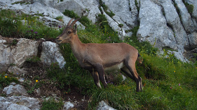 Presenetljivo dobro sem se počutil po nočni turi, tako da sem lahko izpeljal zamišljen krog 😀. Štartam pred 5. uro zjutraj iz Parkirišča na Pecolu in nadaljujem mimo koče Brazza in naprej v smeri Špika Hude police (Cima di Terrarossa). Ravno, ko zajtrkujem, se severna stran Kanina obarva v rdeče barve sončnega vzhoda 😍. Nadaljujem po poti, ki se kar nekaj časa vzpenja v ključih. Vmes srečam nekaj kozorogov in se malce pomenim z njimi 😂. Stezi sledim vse do vrha Špika Hude police (2420 m), kjer me lepo poboža sonce, a se ne ustavljam prav dolgo. Sestopim do križišča poti. Vmes kar naenkrat slišim ropot in zagledam kamen, kako se vali proti meni. Na hitro se malce skrijem, kamen pa odleti kakšna 2 metra mimo. Uf, dobro je 😀. Od tega trenutka naprej sem se z vsakim naslednjim kozorogom dogovoril, da mi ne bo spuščal kamenja. In po večini so se držali dogovora 😁 😎. Na križišču zavijem levo na zavarovano pot Ceria Merlone. Najprej prečim pobočja pod dvema Špikoma, nato pa se povzpnem na škrbino nad Tratico, kjer vstopim v zavarovan del poti. Brez večjih težav se vzpenjam po skalah proti grebenu in Bivaku L. Vuerich, ki stoji na Špiku nad Nosom (2531 m). Bivak je videti odlično, pa še stražarje je imel - kozoroge namreč. Zelo lep kraj, primeren za pavzo 😀. Ko si oddahnem se spustim naprej po poti in prečim pod naslednjim Špikom, to je Špik nad Špranjo (2554 m). Preden ga obkrožim zavijem levo po krušljivi grapi, ki vodi proti vrhu. Brez kakšnega plezanja dosežem prej omenjeni vrh. Sestopim po isti poti do markirane poti in nadaljujem po njej. Tudi iz druge strani je videti, da bi lahko prišel na vrh. Sledi nekoliko strmejši spust proti naslednji škrbini, od tam pa prečim po čudovitih policah pod Nižnjimi vrhovi. Vmes seveda srečujem kozoroge in se dogovarjam, da mi ne valijo kamenja 😁 ene dvakrat sicer še zmeraj poči nekje v bližini tak da se prav pretirano ne obiram. Naslednjih 15 minut je bilo najlepših na celi turi - najprej čudovite police, nato pa še kozoroga, ki sta me spustila na 2 metra in s katerima sem se malce pogovoril, onadva pa sta me le debelo gledala 😎. Kako fantastične živali so to, res 😍. Kar objel bi ga, če bi mi dovolil. Nekaj časa strmiva eden v drugega, nato pa nadaljujem in kaj kmalu zavijem levo po strmih travah na greben in nato desno do možica na Špiku nad Planjo (2411 m). Sestopim na drugo stran po strmem terenu do poti in se spustim do mesta, kjer Ceria Merlone naredi ovinek. Tu zavijem desno po stezi, ki preči pod vrhom Krnega dola (2351 m). Sam se seveda povzpnem nanj, nato pa si malce odpočijem. Pogled proti Višu in sosedom me kar malce "matra" in najraje bi kar nadaljeval v tisto smer, a kdaj drugič. Malce me je skrbelo glede vročine, a sem imel do tu sonca zelo malo. Tu sem bil ob 10ih. Po pavzi sestopim po dobri vidni stezi čez travnata pobočja, kjer je bilo vse polno cvetja 😍. Res lepo. Brez težav se spuščam po stezi mimo nekaj utrdb in po prb. uri hoje sem spodaj v gozdu, kjer dosežem markirano pot proti koči Corsi. Tu zavijem desno in se spustim do planine Krni dol, kjer stopim na cesto. Do izhodišča me loči še slaba ura hoje po cesti. Proti pričakovanjem niti ni bilo tako vroče. Seveda je sledilo še kopanje v Rabeljskem jezeru, nato pa vožnja proti domu.